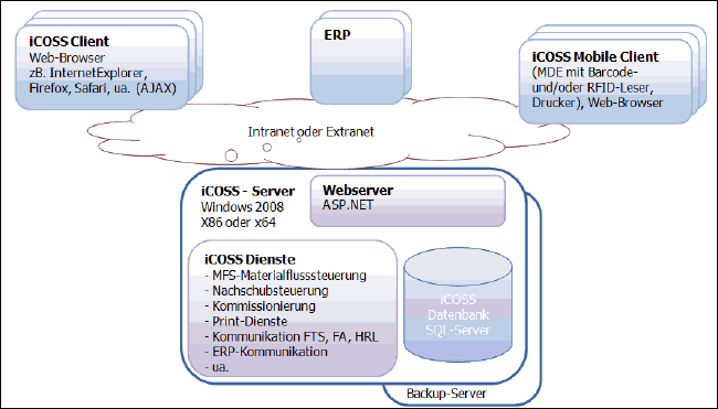 Als iCOSS-Mobile-Clients werden MDE-Geräte und/oder Staplerterminals unterstützt - einzige Voraussetzung: Web-Browser mit AJAX-Support. Die Anbindung erfolgt via WLAN/Datenfunk oder über GSM (Handynetz). |